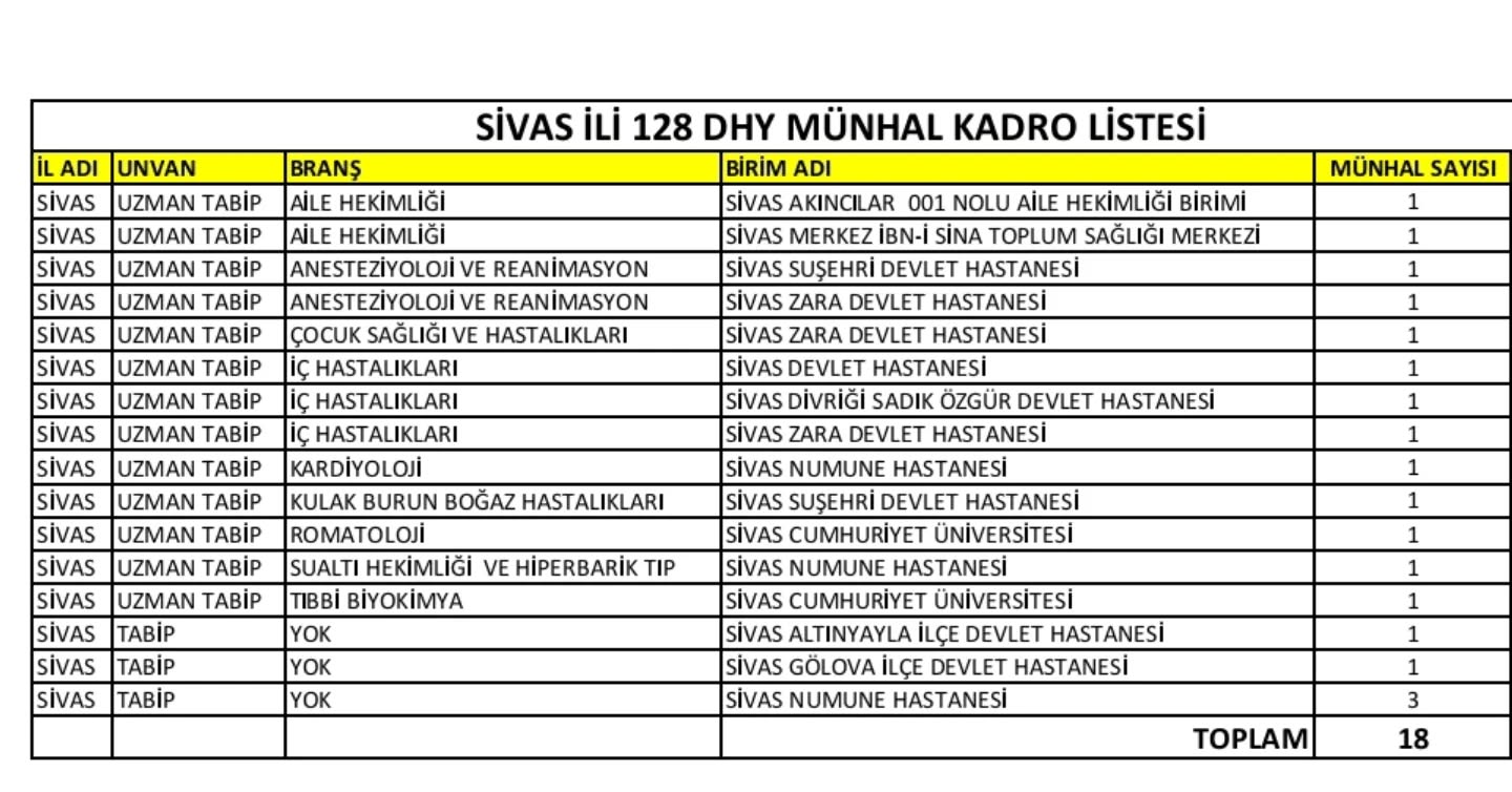 Sağlık Bakanlığı tarafından gerçekleştirilen 128. Devlet Hizmeti Yükümlülüğü (DHY) kurası kapsamında şehre kazandırılan 18 hekim kadrosunun, Sivas’taki sağlık hizmetlerinin niteliğini ve erişilebilirliğini artırması bekleniyor.